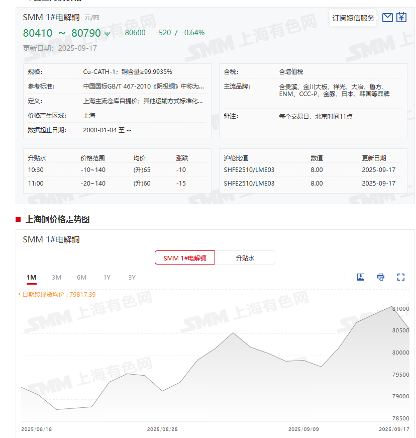 铜现货方面: 9月17日,SMM1#电解铜价格为80410~80790元/吨,较前一交易日下跌520元/吨,跌幅为0.64%。9月17日铜价下跌,下游采购情绪依旧不佳,铜价居高对下游需求的抑制作用仍存,市场观望情绪浓厚。9月17日,上海地区电解铜采购情绪为3.06,销售情绪为3.11。展望明日,铜价继续走跌并未让下游立刻加大采购,预计明日下游继续压价,沪铜现货升水或将进一步走跌。对于铜价后市,短期需关注北京时间18日凌晨美联储议息决议的结果和美联储主席鲍威尔在货币政策新闻发布会的发言。倘若美联储如期降息25个基点,需警惕宏观利好情绪的降温,而美联储倘若未如期降息将使得铜价受抑,而假如美联储降息幅度超预期将提振铜价。
