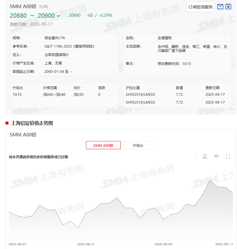 铝现货市场方面:SMMA00铝现货9月17日的均价为20890元/吨,较前一交易日跌0.29%。基本面上:9月正值传统旺季,铝水比例预计小幅回升,虽周度成本受氧化铝支撑减弱有所下滑,但需求端表现迎来回暖,多数型材企业反馈订单情况有所改善,上周国内铝型材龙头企业开工率环比回升1个百分点至54%。库存方面,进入9月出库表现尽管有所起色,但升贴水仍然承压,且据悉近期在途货源虽有减少预期,但下降幅度仍不明显,本周一库存数据再次呈现累库态势,去库拐点能否在9月中顺利出现仍需进一步观察。综合来看,宏观向好预期等均对铝价产生了利多影响,叠加基本面整体表现回暖,SMM预计短期内铝价维持高位震荡。