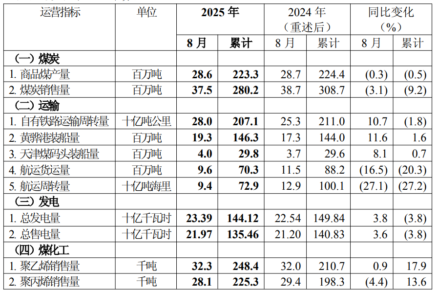 2025 年 8 月,公司自有铁路运输周转量同比增长的主要原因,是自有铁路沿线煤源充足带来铁路运量增加;黄骅港装船量同比增长的主要原因,是到港资源量增加;航运货运量及周转量同比下降的主要原因,是业务结构调整、航线结构变化。