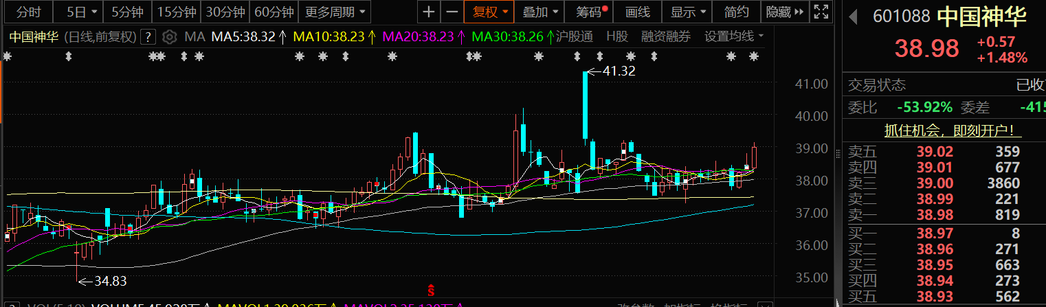 9月17日,中国神华股价出现上涨,截至17日收盘,中国神华涨1.48%,报38.98元/股。