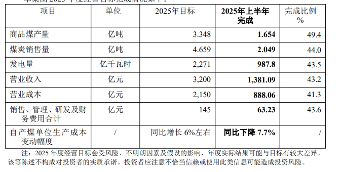 中国神华在其半年报中介绍集团 2025 年度经营目标完成情况如下: