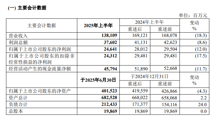 中国神华8月30日发布2025年半年报显示:上半年本集团全力应对煤炭电力量价下行的严峻形势,逆势求进、攻坚克难,安全生产形势保持平稳,一体化运营更加有效,提质增效成果显现。虽然部分生产经营指标同比下降、落后计划,但优于预期、质效向好。 2025 年上半年,集团营业收入 138,109 百万元(2024 年上半年:169,121 百万元,已重述),同比下降 18.3%;实现营业利润 37,364 百万元(2024 年上半年:42,158 百万元,已重述),同比下降 11.4%;归属于本公司股东的净利润 24,641 百万元(2024 年上半年:28,012 百万元,已重述),基本每股收益 1.240 元/股(2024 年上半年:1.410 元/股,已重述),同比下降 12.0%。