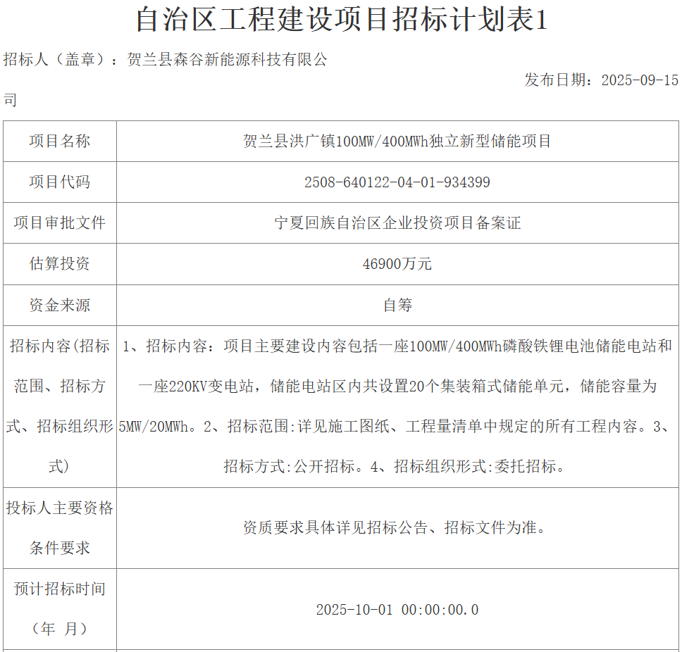 北极星储能网讯:9月15日,宁夏贺兰县洪广镇100MW/400MWh独立新型储能项目招标计划发布。项目估算投资46900万元,折合单价1.1725元/Wh。招标人为贺兰县森谷新能源科技有限公司,为国企银川创新发展投资集团有限公司旗下子公司。