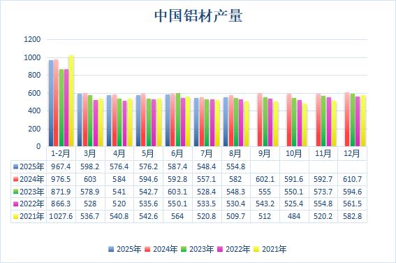 国家统计局发布报告显示,中国2025年8月中国铝材产量为554.8万吨,环比微增1%,同比下滑4.2%。1-8月中国铝材产量为4379万吨,同比基本持平。需求处在淡季和旺季的转换期,产量增幅有限。
