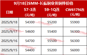 【SMM价格】2025年9月18日长振黄铜棒价格