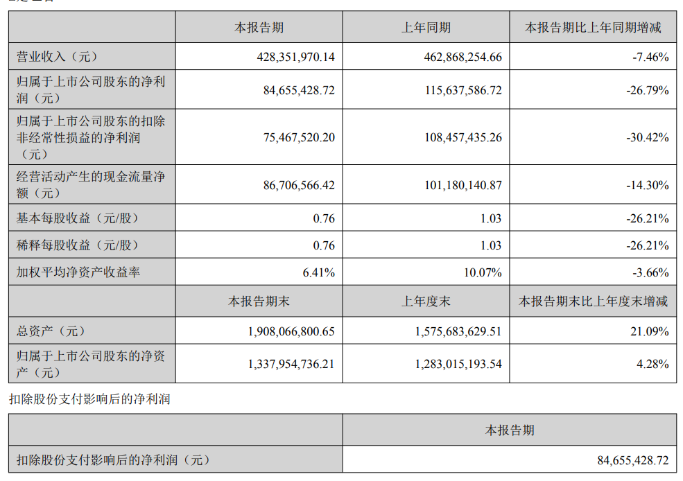 公司2025年上半年实现营业收入4.28亿元,同比下滑7.46%;归母净利润8465.54万元,同比下滑26.79%;扣非归母净利润7546.75万元,同比下滑30.42%。