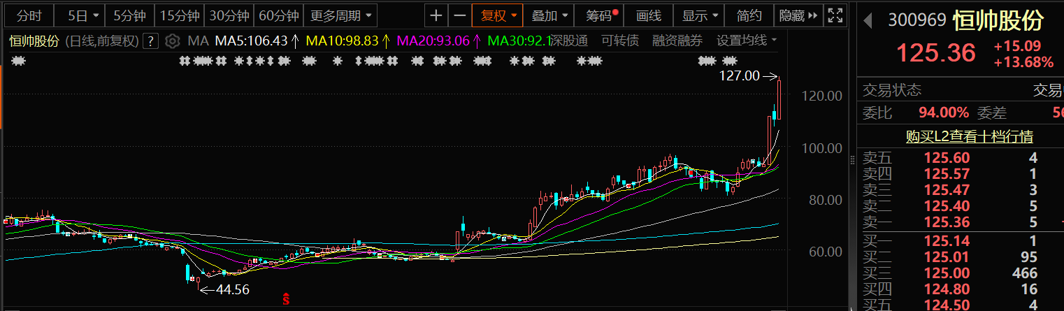 9月18日,恒帅股份股价出现上涨,截至18日11:03分,恒帅股份涨13.68%,报125.36元/股。