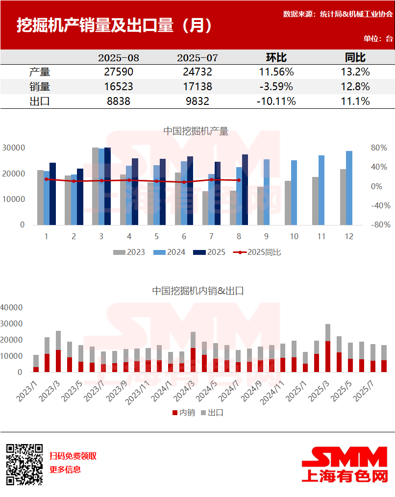 2025年8月销售各类挖掘机16523台,同比增长12.8%。出口量8838台,同比增长11.1%。8月挖掘机产量27590台,同比增长13.2%。