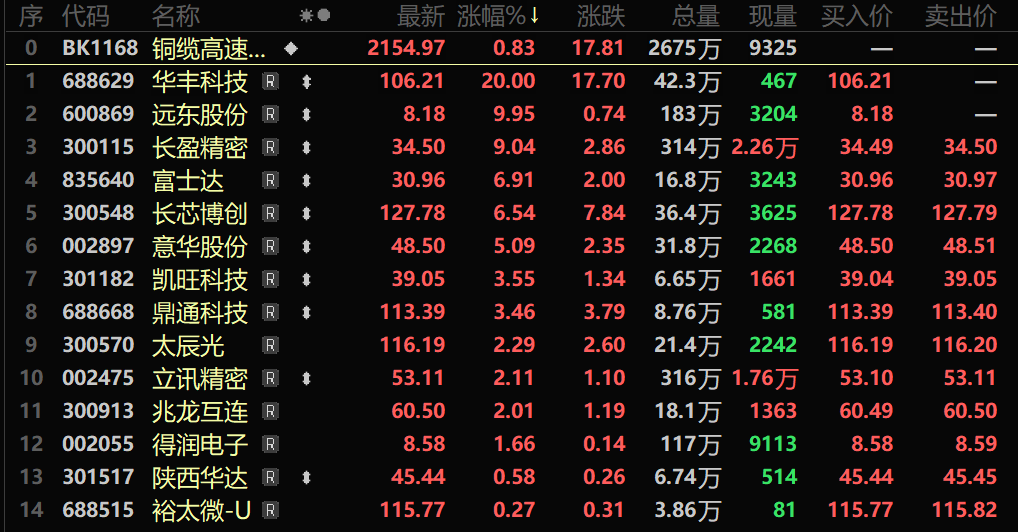 随着人工智能、云计算等新兴技术的蓬勃发展,算力硬件需求呈现爆发式增长。数据中心、服务器等高性能计算设备内部高速互联依赖于稳定可靠的连接方案,铜缆高速连接作为关键基础元器件,不可或缺;高速传输技术不断突破,提升了对高速铜缆的需求;部分企业获得了大量订单提振以及部分市场资金的青睐等带动铜缆高速连接概念走强,截至9月18日收盘,铜缆高速连接概念涨0.83%,个股方面:华丰科技、远东股份涨停,长盈精密、富士达、长芯博创、意华股份以及鼎通科技等涨幅居前。