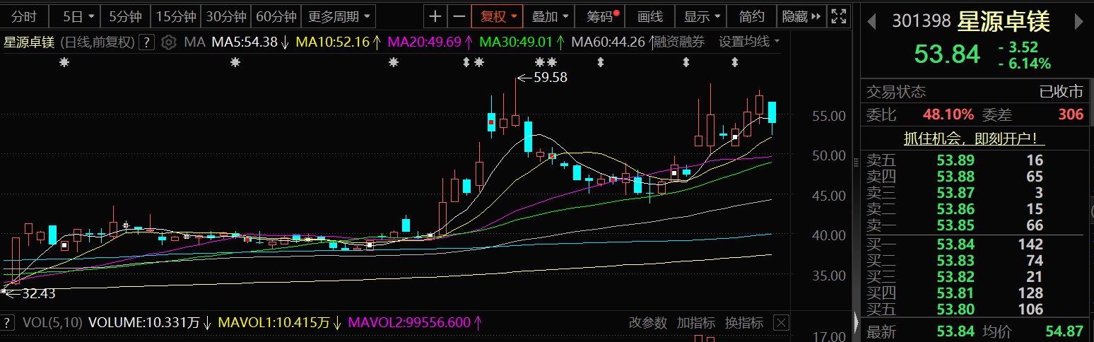 二级市场方面:星源卓镁9月18日股价告别三连涨出现下跌,截至19日收盘,星源卓镁跌6.14%,报53.84元/股。