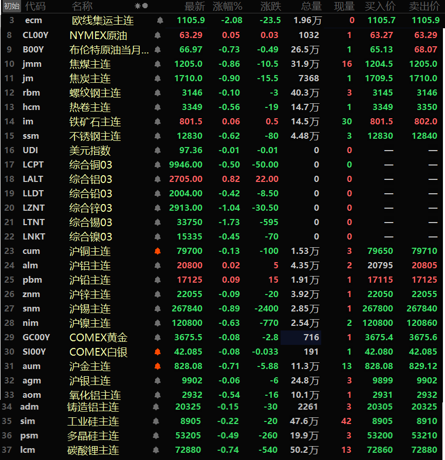 黑色系方面普跌,仅铁矿其唯一上涨,涨幅达0.06%。不锈钢跌0.62%,热卷跌0.56%。双焦方面,焦煤跌0.86%,焦炭跌0.9%。