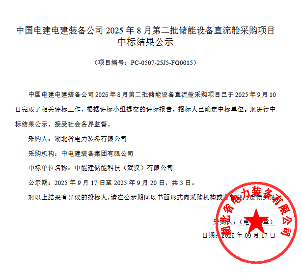 北极星储能网获悉,9月17日,中国电建电建装备公司2025年8月第二批储能设备直流舱采购项目成交结果公示,中能建储能科技(武汉)有限公司中标该项目。