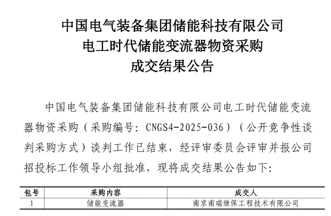 北极星储能网获悉,9月18日,中国电气装备集团储能科技有限公司电工时代储能变流器物资采购中标结果公示,南京南瑞继保工程技术有限公司中标该项目。