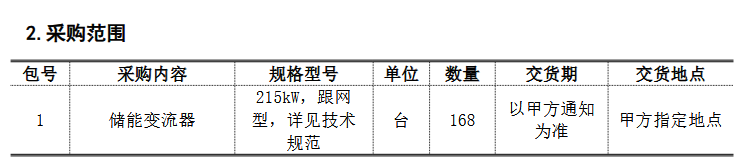 项目采购人为中国电气装备集团储能科技有限公司,采购规格为215kW的储能变流器168台,总规模为36.12MW。