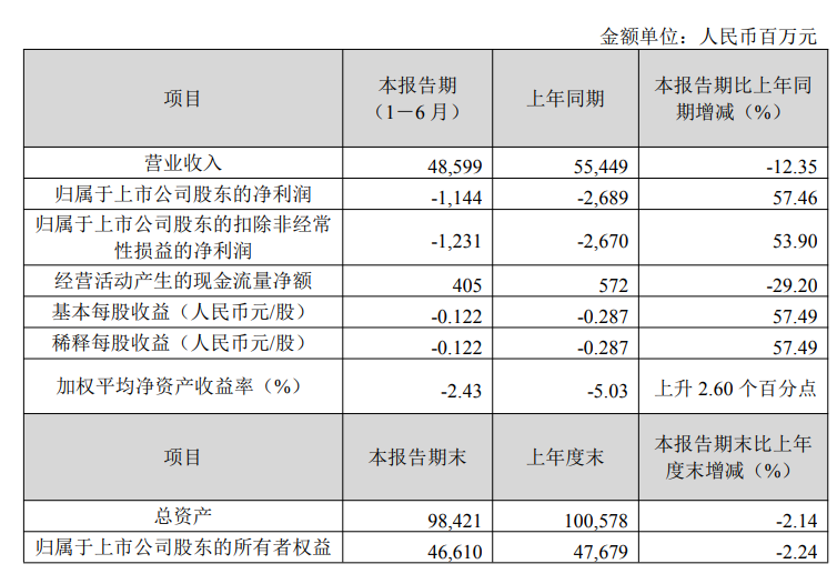 鞍钢股份8月26日公布2025年半年报显示,上半年,集团实现营业收入人民币 48,599 百万元,比上年同期减少12.35%;利润总额人民币-1,069 百万元,比上年同期减亏 59.25%;归属于上市公司股东的净利润人民币-1,144 百万元,比上年同期减亏 57.46%;基本每股收益人民币-0.122 元/股,比上年同期提升 57.49%。