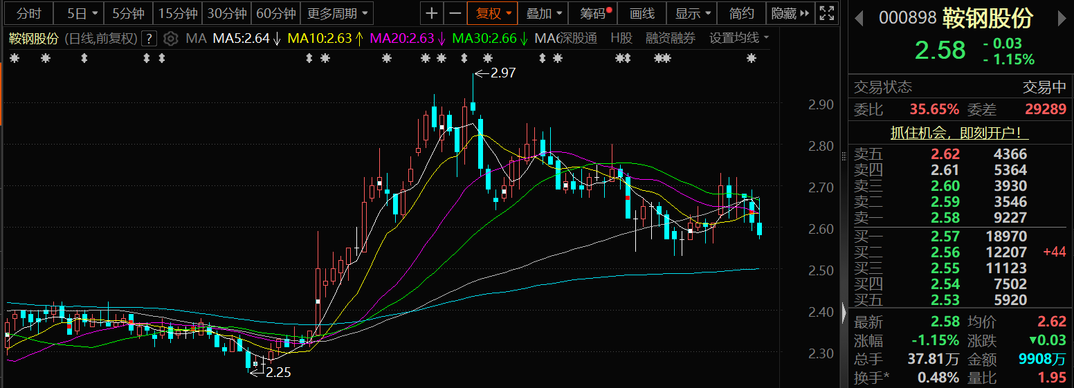 9月19日,鞍钢股份股价出现下跌,截至10:52分,鞍钢股份跌1.15%,报2.58元/股。