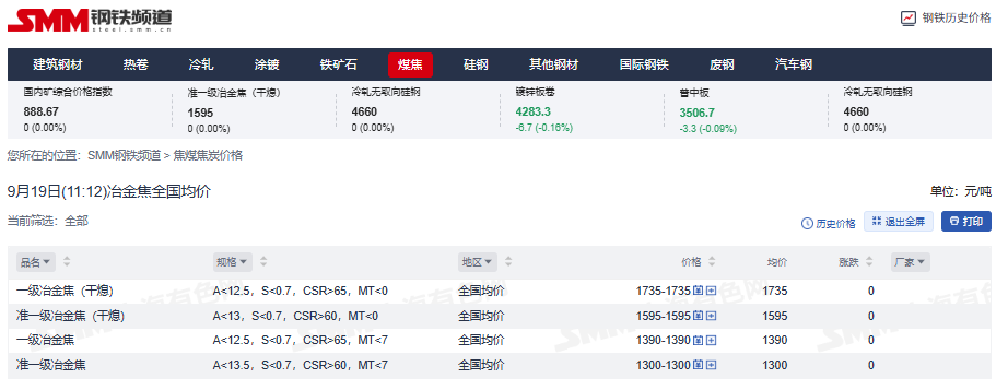 现货价格方面:9月19日,临汾低硫主焦煤报价1510元/吨。唐山低硫主焦煤报价1390元/吨。一级冶金焦-干熄全国均价为1735元/吨。准一级冶金焦-干熄全国均价为1595元/吨。一级冶金焦-湿熄全国均价为1390元/吨。准一级冶金焦-湿熄全国均价为1300元/吨。