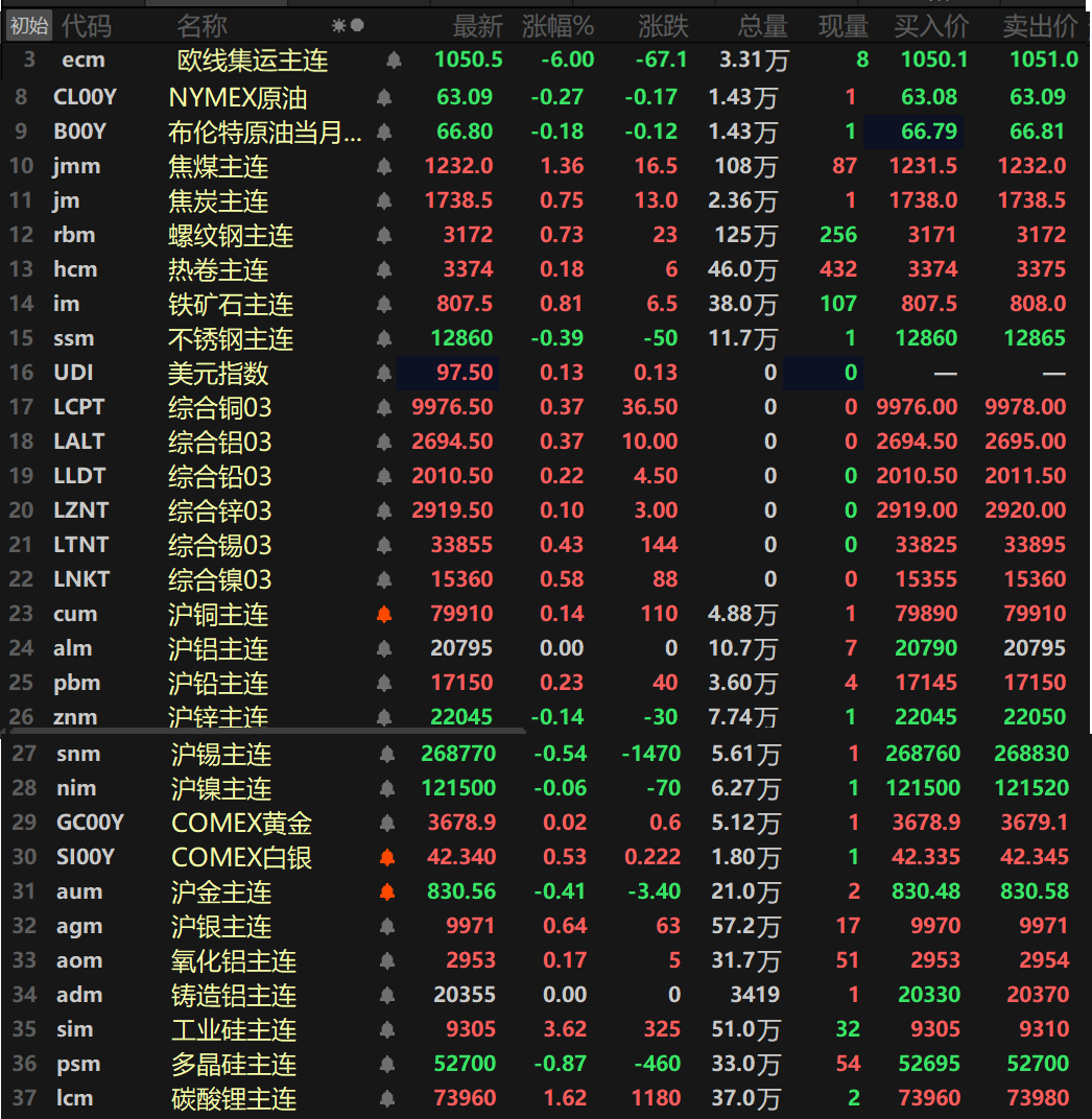 此外,碳酸锂主连涨1.62%,多晶硅主连跌0.87%,工业硅主连涨3.62%。欧线集运主连跌6%报1050.5。