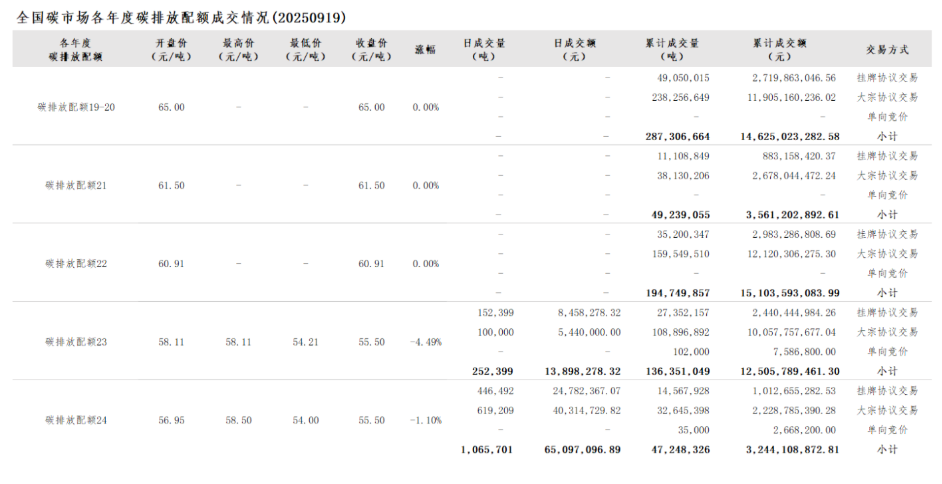 截至2025年9月19日,全国碳市场碳排放配额累计成交量714,894,951吨,累计成交额49,039,717,593.29元。