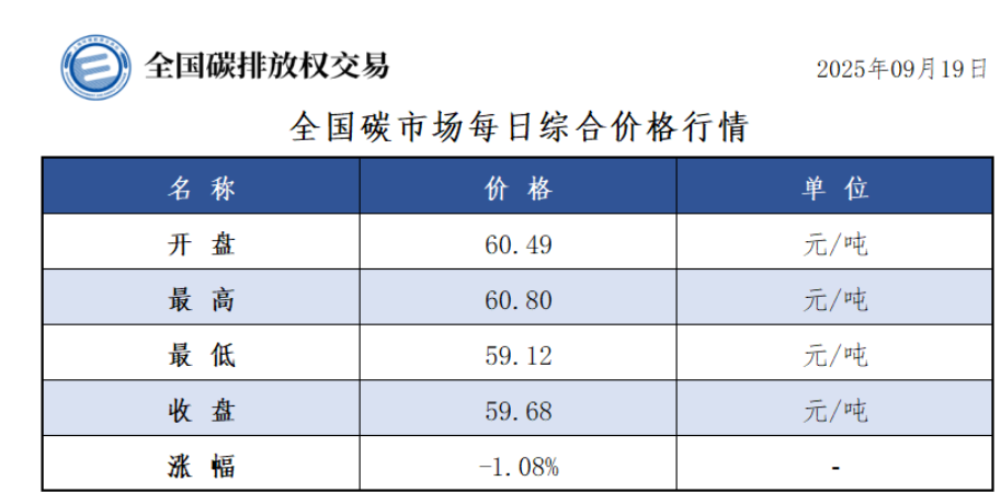 今日全国碳市场综合价格行情为: 开盘价60.49元/吨,最高价60.80元/吨,最低价59.12元/吨,收盘价59.68元/吨,收盘价较前一日下跌1.08%。