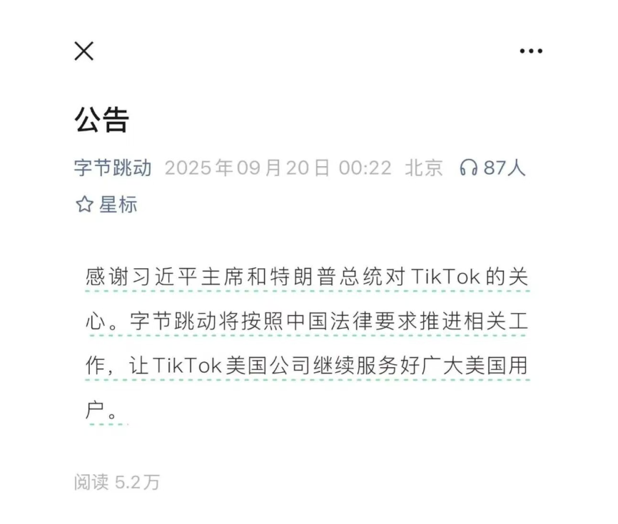 9月20日凌晨,字节跳动发布公告称,将按照中国法律要求推进相关工作,让TikTok美国公司继续服务好广大美国用户。
