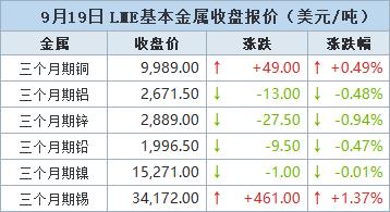 伦敦时间9月19日17:00(北京时间9月20日00:00),LME三个月期铜上涨49美元,或0.49%,收报每吨9,989.0美元。