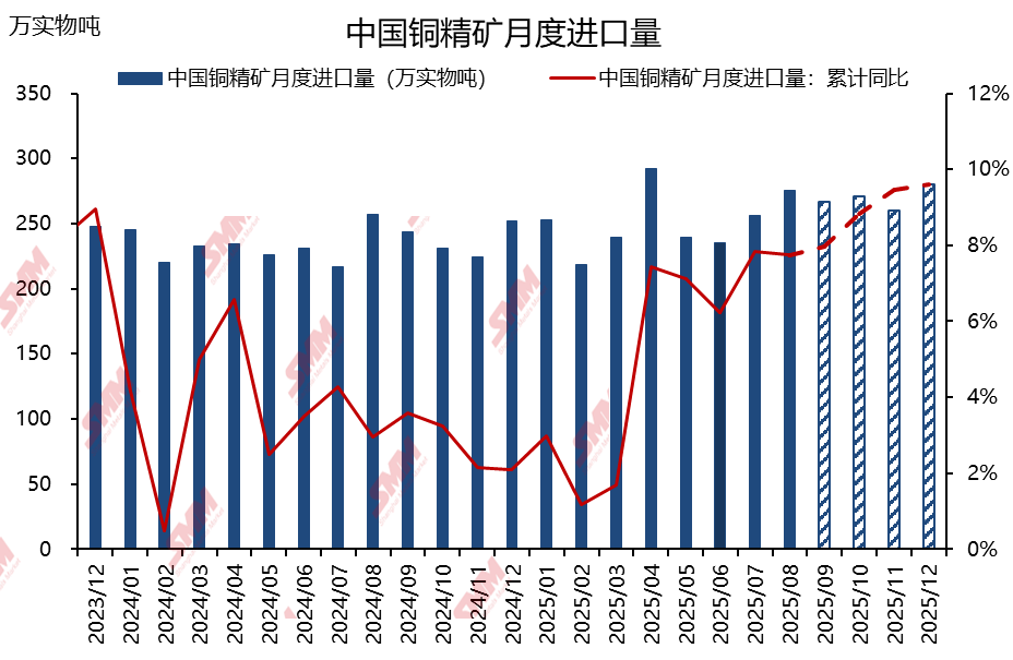 中国铜精矿月度进口量:SMM结合四季度中国冶炼厂检修活动和三季度现货市场的成交情况,SMM认为今年四季度中国铜精矿进口量月均值为257.33万实物吨。今年四季度有检修活动的铜冶炼厂有10家,涉及粗炼产能有100万吨,四季度更普遍的情况是多数冶炼厂对铜精矿需求量并不激进,在四季度里出现像四月份那种创纪录的单月进口量可能性不大,可能月度进口量维持在250-260万实物吨区间内。从三季度的铜精矿现货成交情况来看,中国个别大厂在采购四季度初装运今年年底前到港的铜精矿现货量较为活跃,因此四季度的中国铜精矿进口量可能略高于全年铜精矿进口月均值。SMM预计2025年中国铜精矿进口量为3000-3050万实物吨,同比增加7.8%。(约合750-762.5万金属吨)。