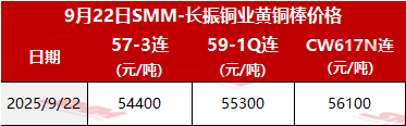 【SMM价格】2025年9月22日长振黄铜棒价格