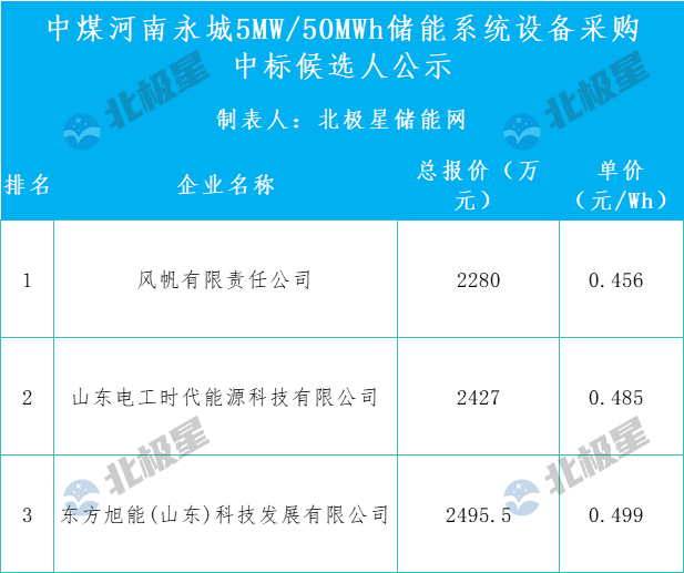 第三中标候选人为东方旭能(山东)科技发展有限公司,投标报价2495.5万元,折合单价0.499元/Wh。