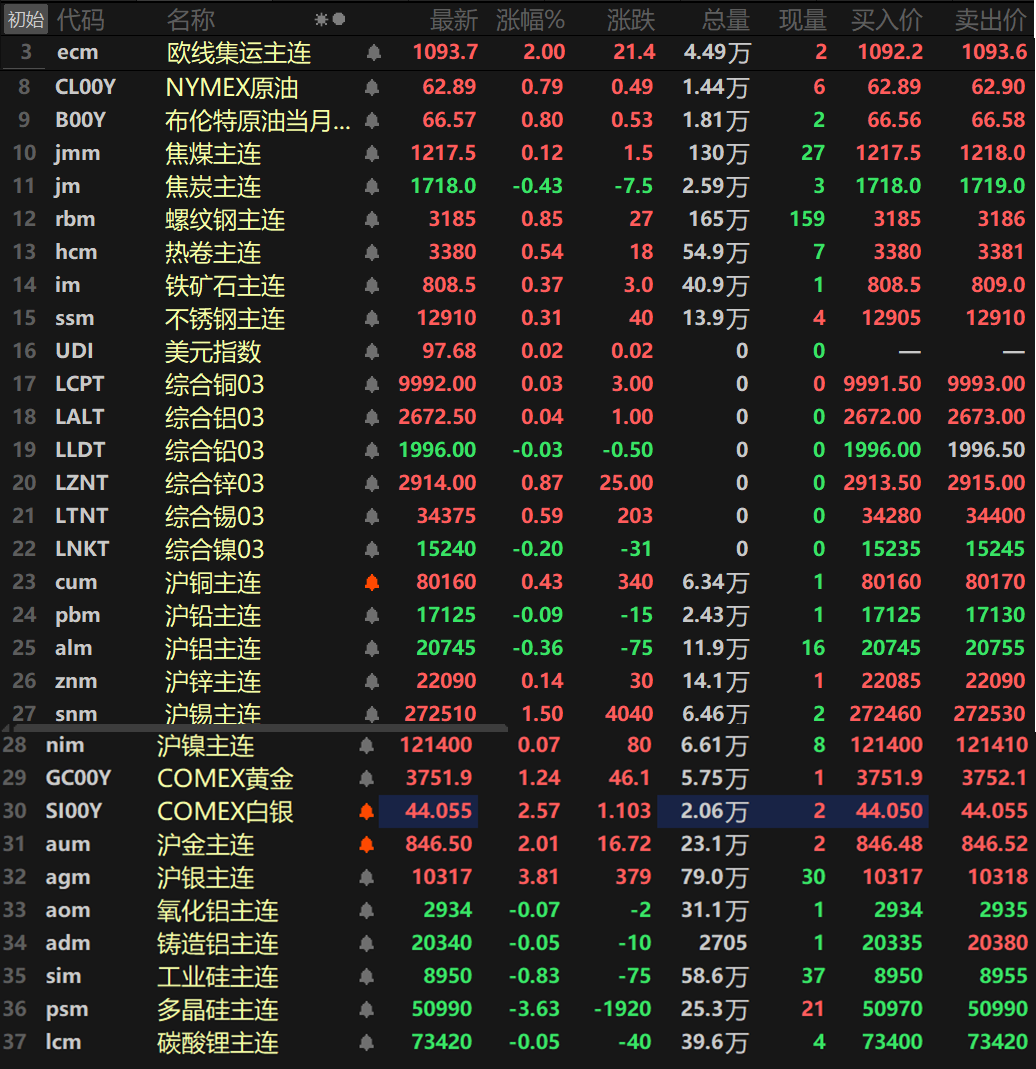 贵金属方面,内外盘贵金属集体刷新历史新高,截至15:03分,COMEX黄金涨1.24%,盘中最高触及3753.4美元/盎司,刷新其上市以来的历史新高;COMEX白银涨2.57%,盘中最高冲至44.105美元/盎司,同样刷新其上市以来的历史新高。国内方面,沪金涨2.01%,盘中最高触及847.26元/克,续刷历史新高;沪银方面收涨3.81%,盘中最高冲至10336元/千克,续刷历史新高。