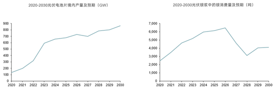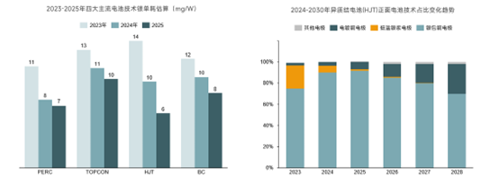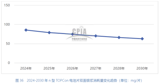 进入2025年三季度,随着技术迭代发展,TOPCon电池双面银浆消耗已从2024年的90-95mg/W下降至80-85mg/W。据CIPA协会《中国光伏产业发展路线图(2024-2025年)》数据,2024年-2030年N型TOPCon电池片双面银浆消耗量仍有继续下滑的空间。