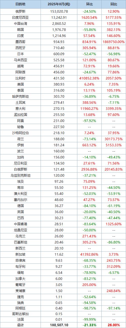 以下为根据中国海关总署官网数据整理的2025年8月氧化铝出口分项数据一览表: