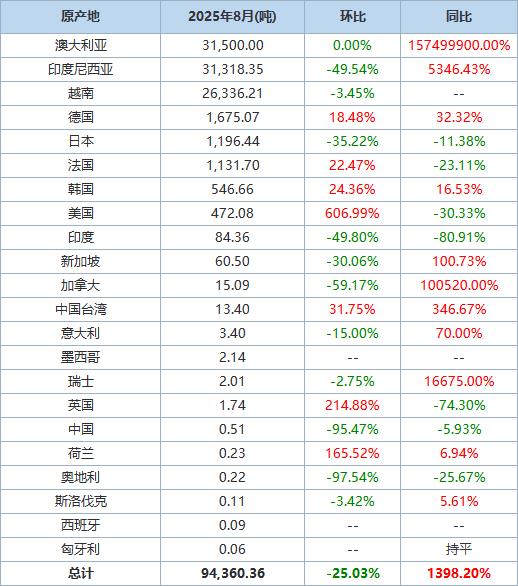 以下为根据中国海关总署官网数据整理的2025年8月氧化铝进口分项数据一览表: