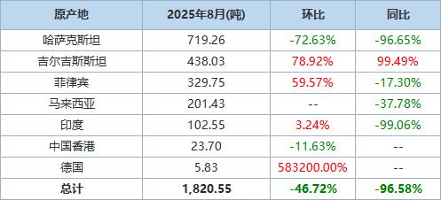 以下为根据中国海关总署官网数据整理的2025年8月精炼铅进口分项数据一览表: