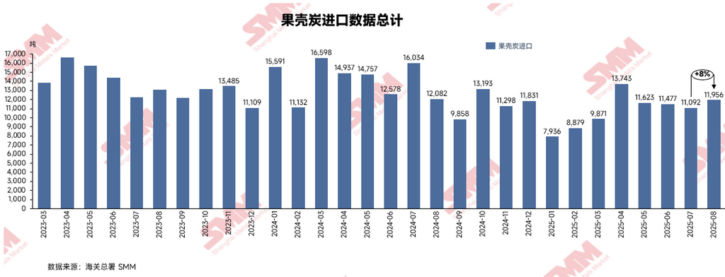 据中国海关总署发布的最新统计数据,2025年8月,我国果壳炭进口量达11,092.3吨,环比上月增长8%,但相较于去年同期仍小幅下滑1%。更值得关注的是价格走势:8月果壳炭进口均价飙升至755.37美元/吨,相比7月的653.97美元/吨,环比大幅上涨16%。