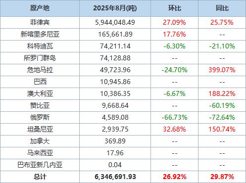 以下为根据中国海关总署官网数据整理的2025年8月镍矿砂及其精矿进口分项数据一览表: