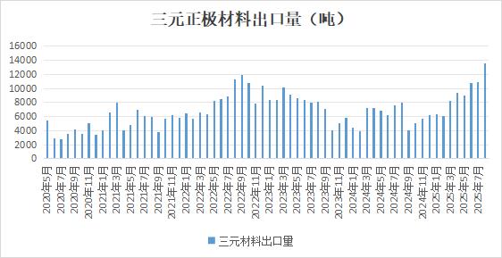 2025年1-8月中国正极材料出口量累计74257吨,同比增幅43.9%。