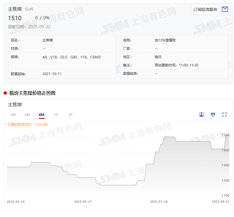 据SMM最新报价显示,9月22日,临汾主焦煤的均价为1510元/吨,较其前一交易日持平。从焦煤原料基本面来看,前期停产煤矿逐步复产,但安全检查依旧严格,焦煤整体供应稳定,下游适当采购补库,煤矿出货顺畅,市场成交氛围比较活跃,近期焦煤价格稳中偏强运行。