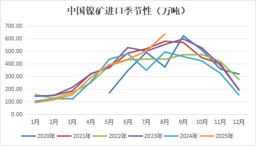 据中国海关数据统计,2025年8月镍矿进口量634.67万吨,环比增加134.09万吨,增幅26.79%;同比增加141.60万吨,增幅28.72%。其中红土镍矿631.87万吨,硫化镍矿2.8万吨。自菲律宾进口红土镍矿594.4万吨,占本月进口量的93.66%。2025年1-8月镍矿进口总量2613.36万吨,同比增加6.47%。菲律宾镍矿进入季节性供应旺季,中国进口镍矿规模快速增长。