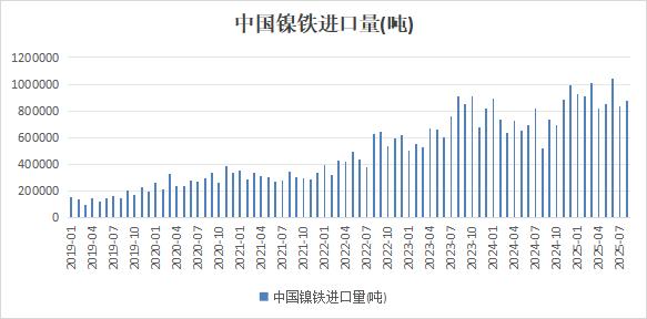 据中国海关数据统计,2025年8月中国镍铁进口量87.4万吨,环比增加3.8万吨,增幅4.6%;同比增加35.2万吨,增幅67.4%。其中,8月中国自印尼进口镍铁量85万吨,环比增加3.6万吨,增幅4.4%;同比增加35.5万吨,增幅71.5%。
