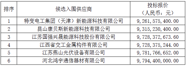 9月19日,中国电力建设集团(股份)有限公司2025-2027年度光伏固定支架框架入围集中采购项目候选入围供应商公示,共有6家企业入围:特变电工集团(天津)新能源科技有限公司、昆山康贝斯新能源科技有限公司、江苏国强兴晟能源科技股份有限公司、江西省交工金属构件有限公司、江苏燕山光伏设备有限公司、河北鸿宇通信器材有限公司。