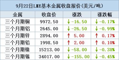 伦敦时间9月22日17:00(北京时间9月23日00:00),LME三个月期铜下跌16.50美元,或0.17%,报每吨9,972.50美元,上周五为上涨0.5%。