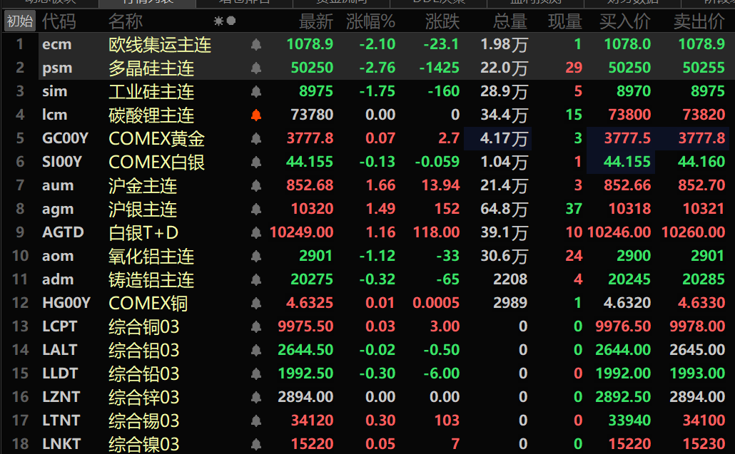 此外,铸造铝主连期货跌0.32%,氧化铝主连跌1.12%。碳酸锂主连平于73780元/吨,工业硅主连跌1.75%。多晶硅主连跌2.76%。