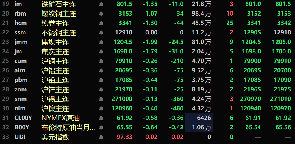 黑色系多飘绿,铁矿跌1.35%,螺纹跌1.07%,热卷跌1.3%,不锈钢平于12910元/吨。双焦方面:焦煤主力合约跌1.99%,焦炭主力合约跌1.79%。