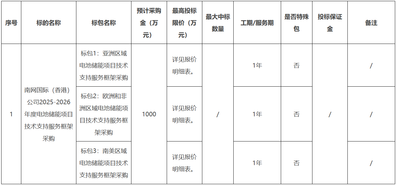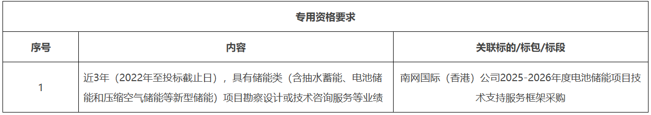 本招标项目南网国际(香港)公司2025-2026年度电池储能项目技术支持服务框架采购,招标人为南方电网国际有限责任公司,项目资金已落实,该项目已具备招标条件,现对本项目进行公开招标。