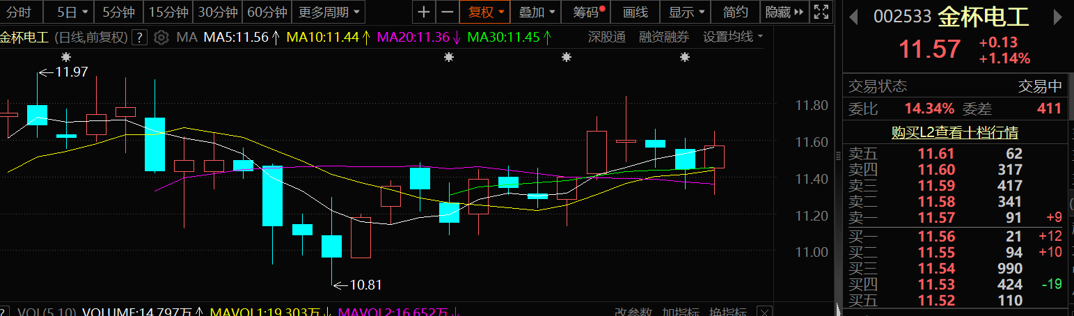 9月23日,金杯电工的股价逆势上涨,截至23日13:24分,金杯电工涨1.14%,报11.57元/股。