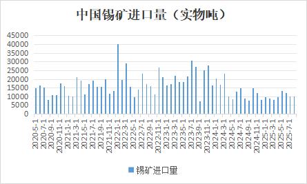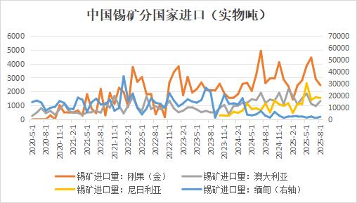 2025年8月,中国进口的锡精矿及其矿砂在数量上环比呈现增加态势的来源地有缅甸、澳大利亚以及东南亚周边地区。就缅甸而言,其境内的佤邦地区目前虽已开启复产进程,但实际进展并不如预期顺利。一方面,缅甸锡矿的品位呈现出下降趋势,且由于采用地下开采方式,这使得开采难度不断增大,开采成本也随之持续攀升。另一方面,在选矿工艺环节中所使用的药剂,全部需要从中国进口。随着原矿品位的降低,药剂成本逐渐上升,这在一定程度上抑制了矿企复产的积极性。尽管目前已有50%-60%的坑道重新开启,但又面临着招工困难、设备调试耗时较长以及部分坑道被弃用等诸多问题,因此暂时还未能实现规模化的产出。