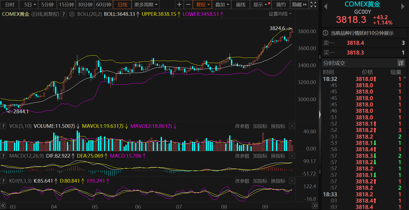 贵金属方面集体上行,截至15:04分,COMEX黄金涨0.38%,盘中最高冲至3795.1美元/盎司,随后,纽金涨势未止,成功突破3800美元/盎司的整数关口,截至18:42分,其最高冲至3824.6美元/盎司,迭创历史新高!