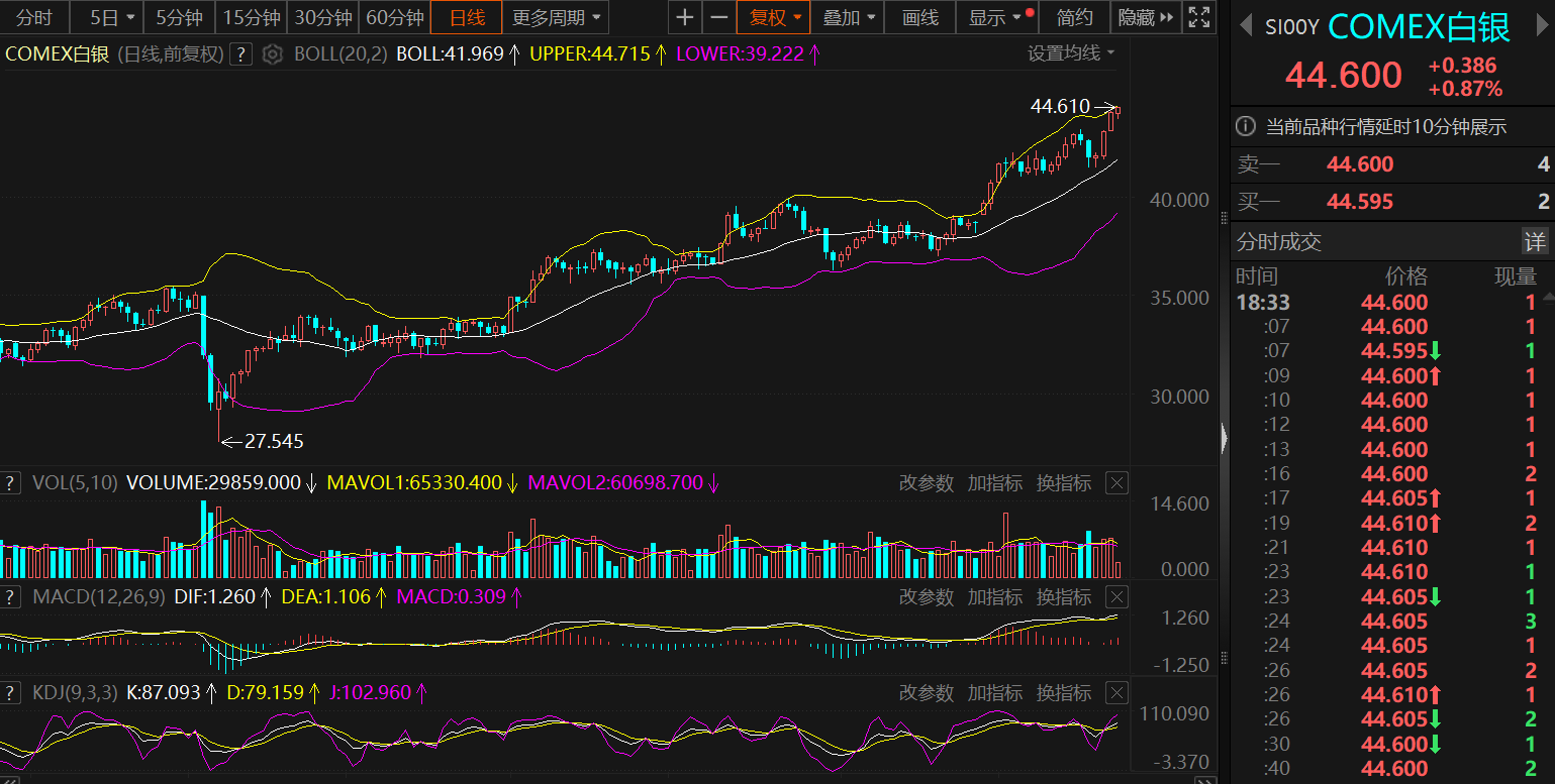 COMEX白银也一同上涨,截至18:43分,其盘中最高冲至44.61美元/盎司,同样刷新其上市以来的历史新高;