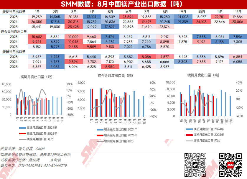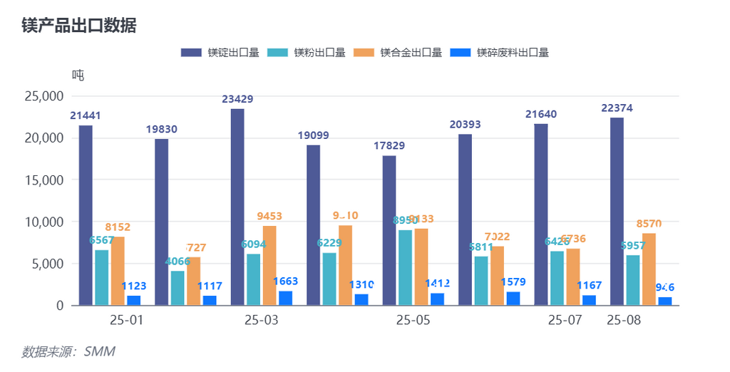 2025年8月中国镁产品出口:环比同比双增长,但市场高位运行抑制需求